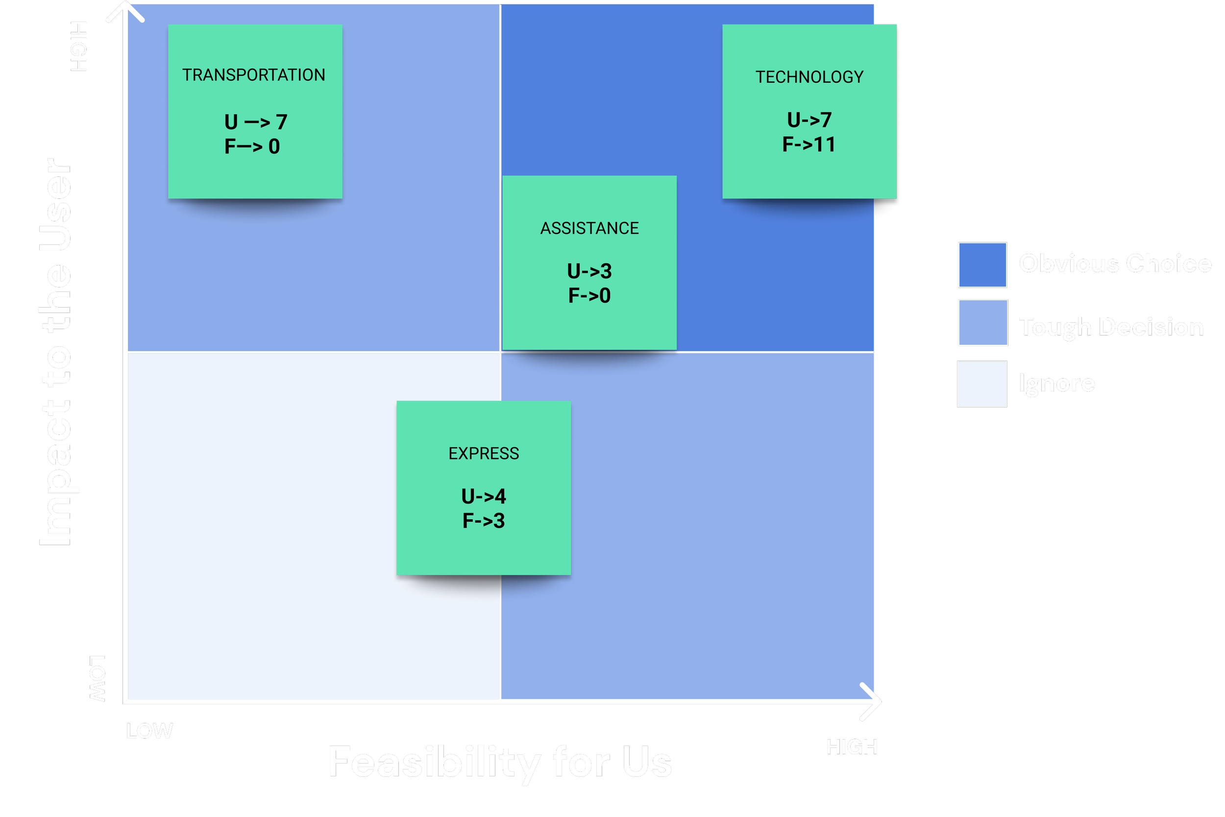 Categories where graphed based on individual votes on their impact for the user (U) and the feasibility (F).